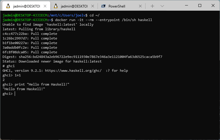docker run -it --rm --entrypoint /bin/sh haskell