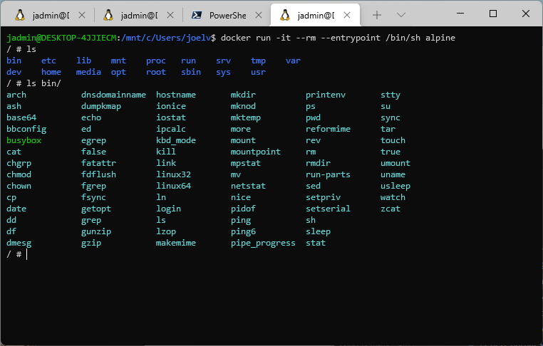 docker run -it --rm --entrypoint /bin/ash alpine